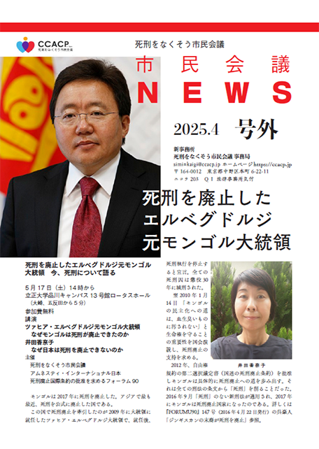 「市民会議ニュース」号外を発行いたしました 2026.01.09 ■目次【講演告知】 2025年5月17日、立正大学品川キャンパスで、ツァヒア・エルベグドルジ元モンゴル大統領を招聘した「なぜモンゴルは死刑が廃止できたのか」の無料講演会を開催 【市民会議からのお知らせ】 袴田事件再審無罪判決と死刑制度の廃止/運営委員長退任に当たって/運営委員長交代のあいさつ